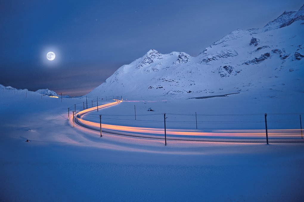 Hier geht jedem ein Licht auf: Die nächtliche Sonderfahrt startet in St. Moritz und führt vorbei am ewigen Eis des Morteratschgletschers und am Lago Bianco bis nach Alp Grüm.