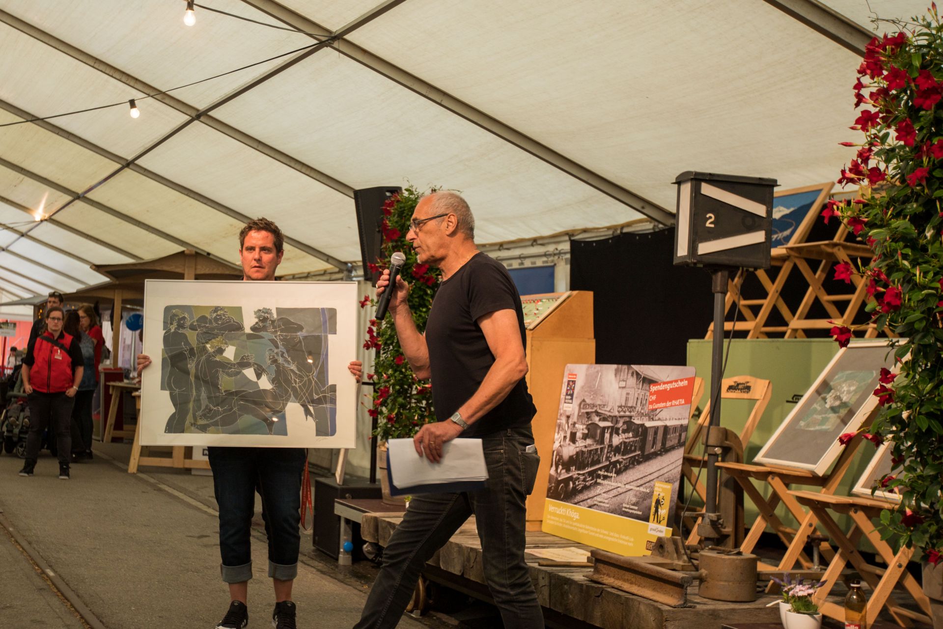 - Eine kleine Auktion, an welcher auch Bilder aus einem Nachlass für den Club 1889 versteigert wurden, brachte durch Aufrundung durch die Stiftung Bahnmuseum Albula Bergün zum Schluss 5000 Franken für die Dampflok «RHÆTIA». Der entsprechende Check wurde vom Bahnmseums-Geschäftsführer Roman Sommer sowie dem Stiftungsratspräsidenten Reto Crameri den zwei Vertretern der Projektgruppe «RHÆTIA» am Sonntag Nachmittag überreicht.