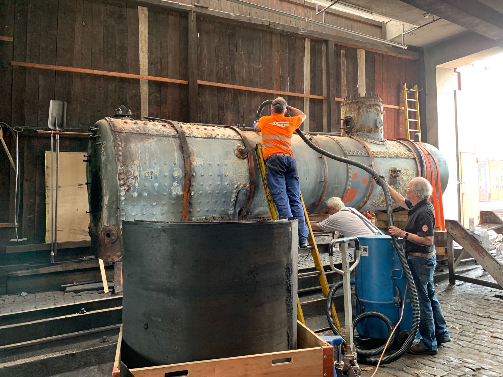 Durch diese Arbeitsschritte können nun der Kessel und die Feuerbüchse aufs Beste inspiziert werden und die Ausschreibung für die Neuerstellung der kupfernen Feuerbüchse geplant werden.
