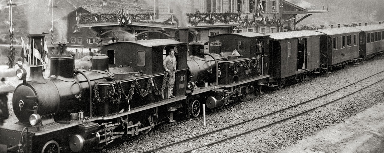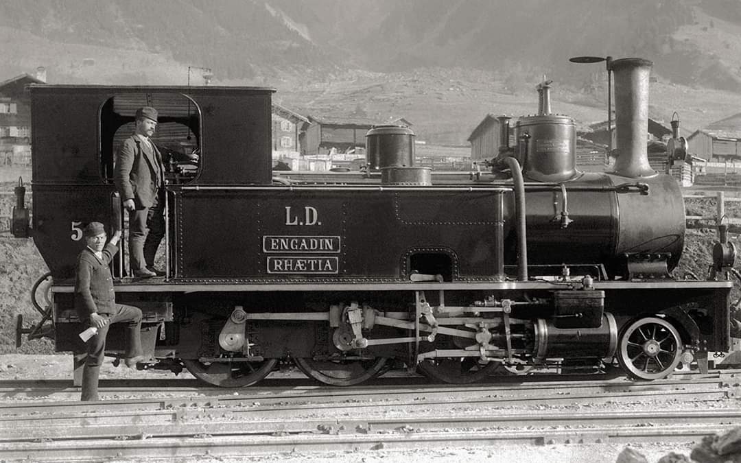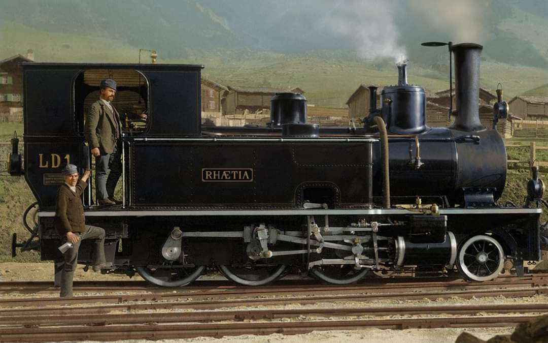Visualisierung der «RHÆTIA», anhand einer Fotografie der G 3/4 Nr. 5 «ENGADIN» in Klosters Platz. Das Bild wurde durch Fabian Gregoire (Präsident des Velay-Expresses in Frankreich) sehr aufwendig coloriert