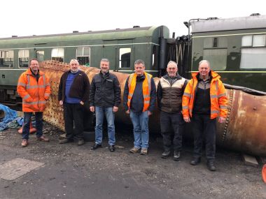 Zudem erreichten uns fröhliche Grüsse aus dem Werkstattgelände der North Norfolk Railway im Westen von Grossbritannien (v.l.n.r.): Robin Monday (ehemaliger Werkstattchef der NNR und aktuell mit 60-%-Pensum bei NNR), NNR-Chef-Ingenieur Peter Phillips, Inhaber der Swiss Railway Services Mike Ellis, die RhB-Angestellten Alex Graf und Reto Marc sowie Keith Ashford (Chefmechaniker).